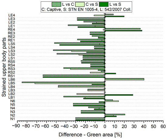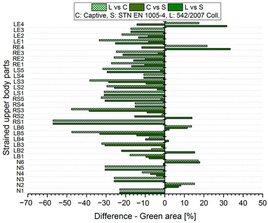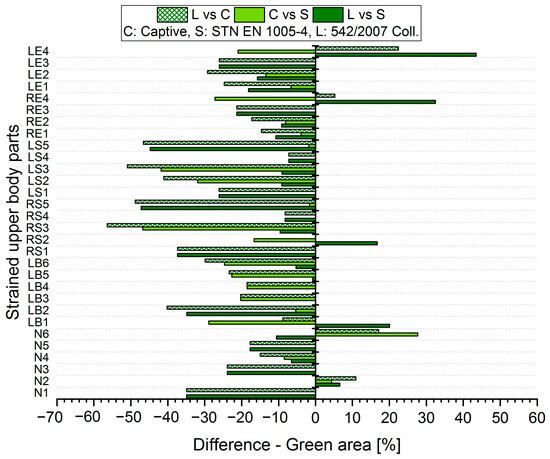 The resulting values of the differences in the acceptable posture (Green area, Figure 5 and Figure 6) show that when comparing the SK Legislation and Captiv methods (L vs. C), the Captiv method significantly reduces the percentage in the acceptable posture in most of the stressed body parts (the differences are negative). The case is similar when comparing the SK Legislation and STN (L vs. S) or Captiv and STN (C vs. S) methods.