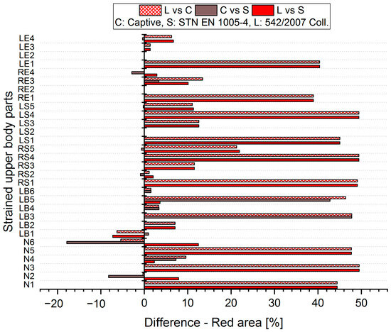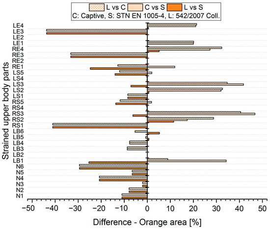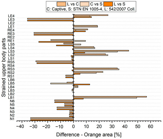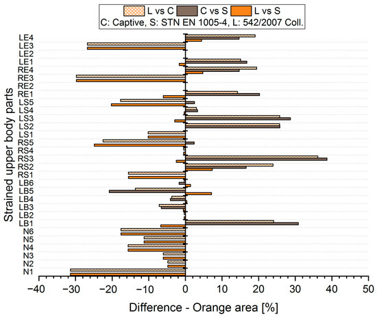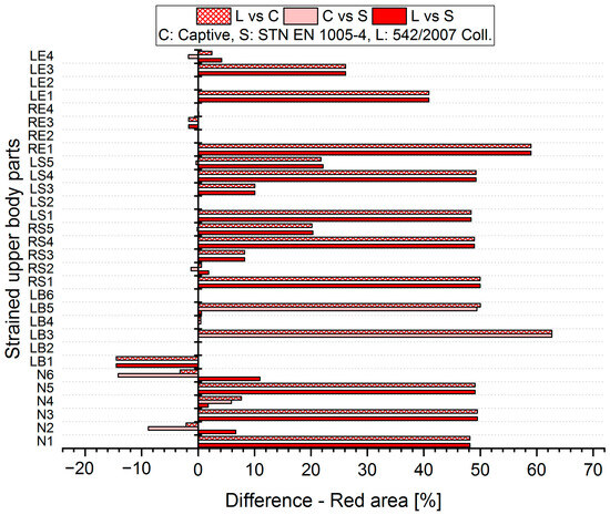 The resulting values of the differentials for the unacceptable position (Red area, Figure 9 and Figure 10) show that when comparing the SK Legislation and Captiv methods (L vs. C), the Captiv method significantly increases the percentage in the unacceptable position in most of the stressed body parts (the differentials are positive). Similar results are obtained when comparing the SK Legislation and STN (L vs. S) or Captiv and STN (C vs. S).