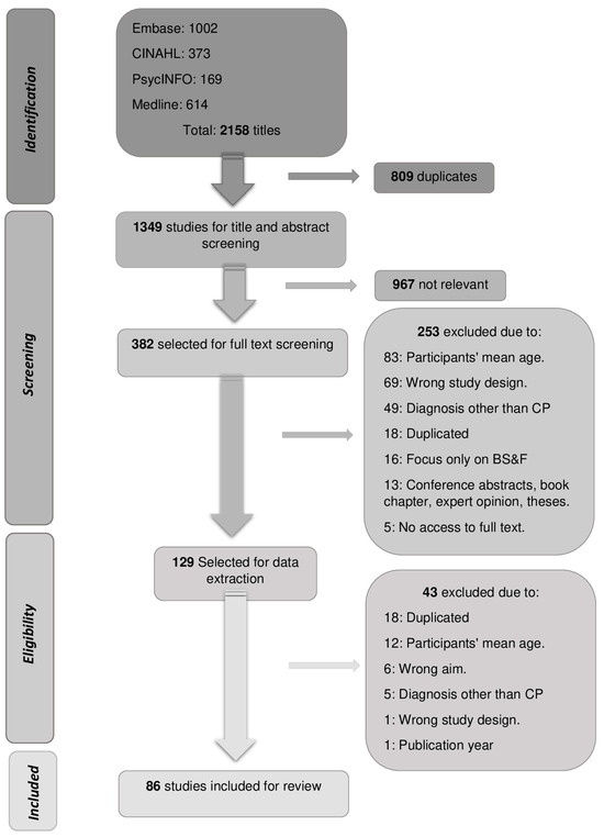 Considering that, during adolescence and young adulthood, youth are transitioning to adult life and developing globally as unique persons, the following five key areas of interest were defined for the literature search based on our focus of interest and the general outcomes expected in adult life: cerebral palsy, adolescents/young adults, health development, participation, and independence. Librarians with experience in health sciences were consulted to guide the structure of the search strategy and provide useful databases to be searched. The search strategy defined was adapted according to each database, and a complete example can be seen in Supplementary Information S2. Through the OVID interface, we searched Medline, EMBASE, and PsycINFO, and, through the EBSCOhost, we searched CINAHL, limiting the articles to those published between 2014 and 2021 in the English language.