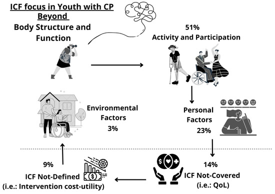 ICF foci of studies addressing aspects related to health development, independence, or the participation of AYAs with CP. Legend: ICF: International Classification of Functioning, Disability and Health; CP: Cerebral Palsy; QoL: Quality of Life.