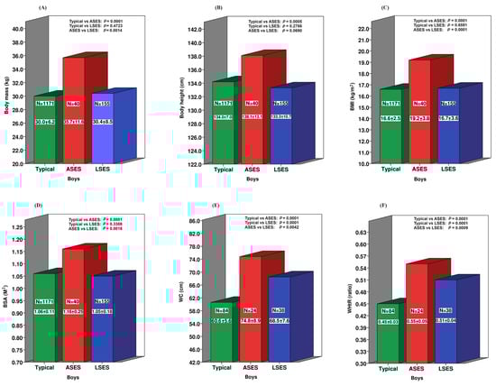 Socioeconomic disparities in the anthropometric measurements between ASD and neurotypical boys. (A) Body mass; (B) Body height; (C) Body mass index; (D) Body surface area; (E) Waist circumference; (F) Waist-to-height ratio.