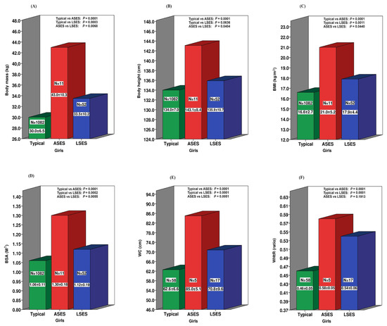 Socioeconomic disparities in the anthropometric measurements between ASD and neurotypical girls. (A) Body mass; (B) Body height; (C) Body mass index; (D) Body surface area; (E) Waist circumference; (F) Waist-to-height ratio.