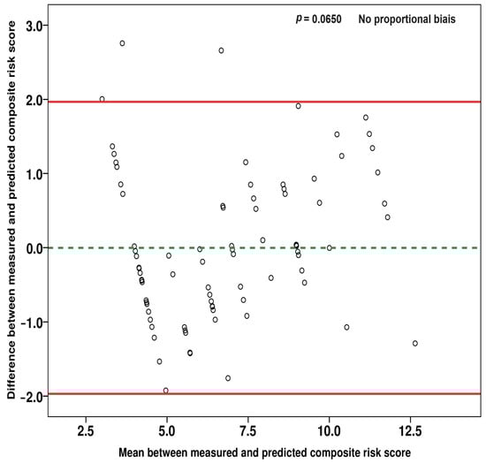 Bland–Altman plot comparing the measured versus the predicted values of the CRS. The two red lines represent the confidence interval (CI95%) and the green dashed line represents the mean of the differences between the two compared methods of measurements.