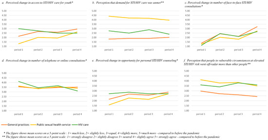 Ten questions measured observed changes in STI/HIV care in the participants’ healthcare practice since the start of COVID-19 compared to before. Four questions addressed the estimated number of face-to-face contacts, telephone or online consultations and referrals to private testing providers and perceived access for key populations (youth, men having sex with men (MSM), sex workers), for example, ‘The access to STI/HIV care for sex workers in my practice was…’. Participants were asked to rate each item for each of the four periods, compared to pre-COVID-19, with responses given on a five-point scale from 1 (a lot less) to 5 (a lot more).