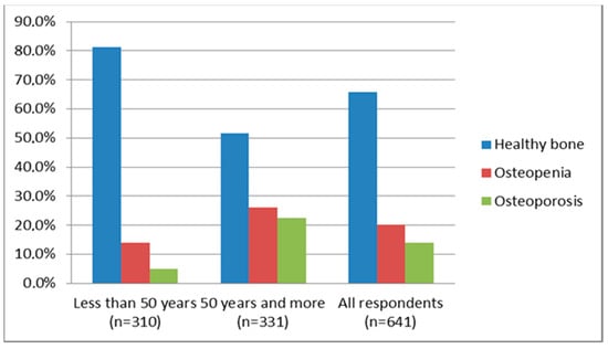 The mean BMI was 24.2 (7.05) kg/m2. In patients who were below 50 years of age, the mean BMI was 23.2 (6.12) kg/m2, and in patients who were 50 years and older, the mean BMI was 25.3 (7.5) kg/m2. According to the results of the questionnaire, 29 (4.5%) respondents indicated that they smoke cigarettes, and 11 (1.7%) people indicated an unhealthy habit in the form of alcoholic beverage intake. A history of a use of hormonal therapy (past or present) was indicated by 74 (11.5%) people. Regarding fractures after minor injuries and falls, these were reported by 112 (33.8%) respondents from the age group of over 50 years out of the 158 people in total who reported such injuries. The BMD measurements of all respondents showed the following results: 20.2% had a low bone mass (osteopenia), 13.9% had osteoporosis, and 65.9% had normal BMD (Figure 1). The highest BMD reduction was observed in the group who were 50 years and older (Table 1 and Table 2). The results of the nutrition preference questionnaire in the two age groups are presented in Table 3.