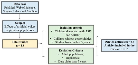 To consult scientific articles and delve deeper into the topic, the following descriptors were used: Synthetic food coloring, Behavior, Processed foods, Food additives, Toxicity, Artificial food coloring, Attention deficit hyperactivity disorder, Behavioral problems in childhood, Autism spectrum disorder, Avoidant/restrictive food intake disorder, Behavioral disorders, Neurobehavioral abnormalities. The methodology for preparing this work can be seen in detail in Figure 1.