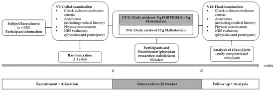 The examination was approved by the Institutional Review Board of the Freiburg International Ethic Commission (CRI2012-KS02) and registered in the German Clinical Trials Register (DRKS00009553). When participants who meet the eligibility criteria gave their written informed consent, they were randomized (ratio 1:1) to the collagen peptide (CP-G) or placebo group (P-G). The randomization list was generated by a web-based random number generator [52]. Both the participants and study personnel directly involved in the running of the study were blinded. At baseline (V0, initial examination) and after 12 weeks (V12, final examination), efficacy endpoints were assessed. Furthermore, inclusion and exclusion criteria were checked via anamnesis and physical examination. All testing was supervised by experienced practitioners (licensed physician and researcher) that were contacted by phone if any concerns occurred during the intervention phase. Participants were told to maintain their usual diet to isolate the effects of the nutritional intervention. The different study phases of the 12 weeks of intervention are displayed in Figure 1.