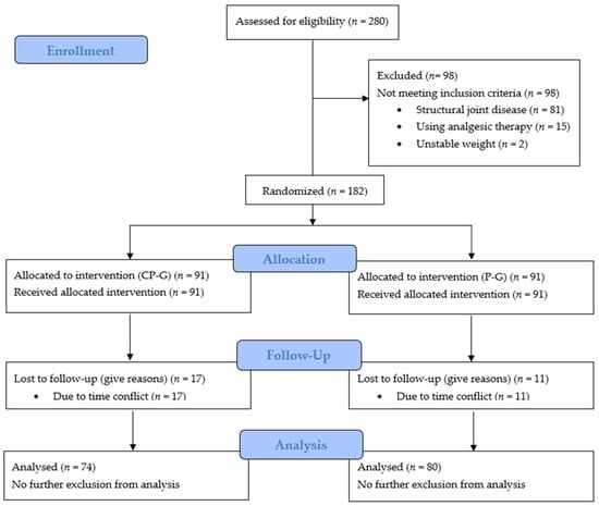 In total, 280 subjects were screened for eligibility. In total, 154 of the 182 participants completed the trial and were statistically analyzed (Figure 2). A total of 74 subjects in the CP-G and 80 in the P-G were analyzed, respectively (per-protocol [PP] population). Dropouts were related to voluntarily termination of the study because these participants did not want to continue the intervention. The routine anamnesis did not reveal any adverse events or pathological findings.