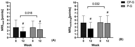 Absolute changes in pain (NRS score) for the primary endpoints (A) pain at rest and (B) pain during walking assessed by the physician. Data are shown as mean ± SD. # p < 0.05 Wilcoxon signed-rank test for changes compared to baseline. Significance between groups in Mann–Whitney U-test.