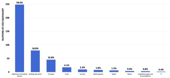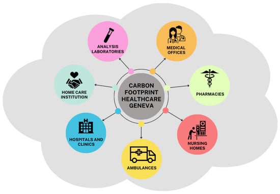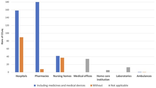 The following supporting information can be downloaded at: https://www.mdpi.com/article/10.3390/ijerph21060690/s1, Figure S1: Greenhouse gases emissions breakdown of the Hospitals sub-sector; Figure S2: Greenhouse gases emissions breakdown of the Pharmacies sub-sector, without medicines; Figure S3: Greenhouse gases emissions breakdown of the Pharmacies sub-sector, with medicines; Figure S4: Greenhouse gases emissions breakdown of the nursing homes sub-sector; Figure S5: Greenhouse gases emissions breakdown of the medical offices sub-sector; Figure S6: Greenhouse gases emissions breakdown of the homecare institution sub-sector; Figure S7: Greenhouse gases emissions breakdown of the ambulance sub-sector; File S1 supplementary_emissionfactors.