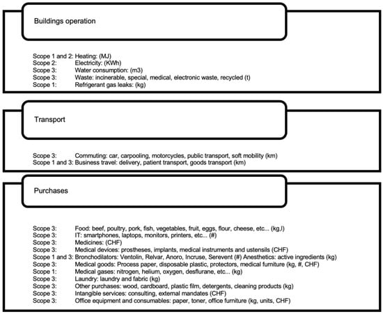 The raw data collected were then converted into equivalent tonnes of CO2 (tCO2eq) (Figure 4). In most cases, the data were presented in the form of quantities, such as kilometres driven, CHF, kWh, and MJ. Our methodology is inspired by two studies that also aimed to estimate the carbon footprint of a healthcare system at a broader range, the NHS Net zero initiative for the British healthcare system and The Shift Project for the French one.