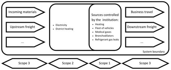 System boundary diagram summarising the different sources of CO2 emissions attributed to a healthcare institution (adapted from the French methodology for carrying out greenhouse gas emission assessments [9]).