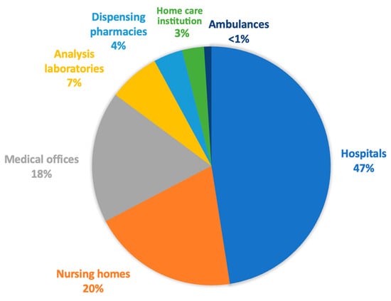 In a second analysis, where we include medicines and medical devices, the situation is quite different. In our study, the term “pharmacies” refers exclusively to retail pharmacies, with the exception of hospital pharmacies, whose business model is mainly based on the sale of medicines. While the carbon footprint of medicines can only be indirectly attributed to pharmacies, they are at the top of the list of GHG emissions for the purchase of medicines, ahead of hospitals (Table 3 and Figure 6).