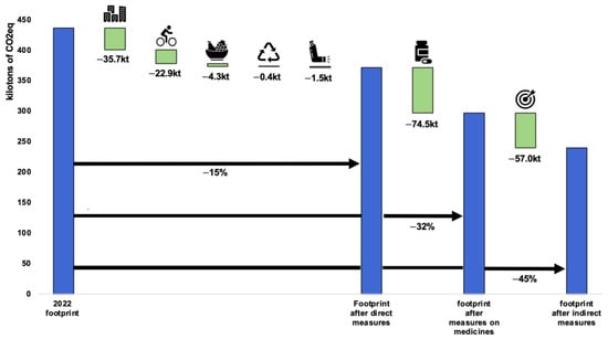 We decided to combine the scenario with the ambitious efforts for 2030 and the modest efforts for 2040, as their targets are close to each other, namely −43% for 2030 and −46% for 2040 (Figure 9). We therefore chose −45% as the target and created this scenario with the various reductions broken down by item. In this scenario, direct measures would contribute to a 15% reduction in the carbon footprint, while medicines and indirect measures would make it possible to achieve the final target of −45%.