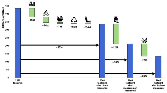 Again, it will be possible to reduce the carbon footprint by −23% through direct action alone, mainly from heating buildings and transport. We assume that, by 2040, medicines will only be produced and transported using low-carbon energy sources and that their overconsumption will be fully under control. We also assume that our proposals for indirect measures such as prevention and health promotion, the digitalisation of the healthcare system, and the introduction of active transport and healthy eating within planetary boundaries will help to reduce the carbon footprint by 69% or more.