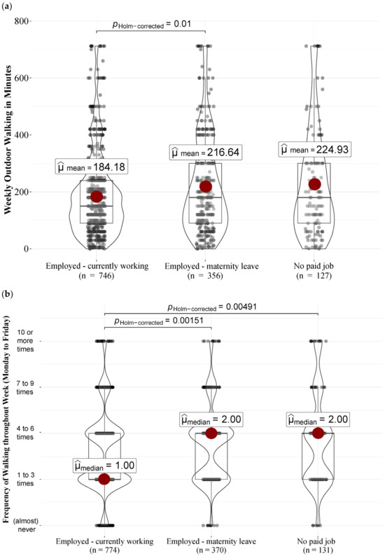 Greater maternal enjoyment of outdoor walks was related to a longer weekly duration of walking (r(1210) = 0.24, p = 0.000, 95%CI [0.18, 0.29]), as well as higher frequencies of walking on weekdays (r(1210) = 0.20, p = 0.000, 95%CI [0.14, 0.25]) and on weekends (r(1210) = 0.23, p = 0.000, 95%CI [0.18, 0.29]). There was also a difference for maternal education in the frequency of walking on weekdays (U = 188,846, N = 1275, r = 0.13, p = 0.000) and on weekends (U = 174,236, N = 1271, r = 0.08, p = 0.004). Higher-educated mothers reported walking approximately ‘one to three times’ (Mdn = 1, M = 1.57) with their infant on weekdays, while lower-educated mothers reported walking ‘four to six times’ (Mdn = 2, M = 1.83). Likewise, on weekends, higher-educated mothers (Mdn = 1, stands for ‘one to three times’, M = 1.10) reported a slightly lower frequency of walking than lower-educated mothers (Mdn = 1, M = 1.22). We found a shorter weekly duration of walking (F(1227) = 8.34, η2 = 0.01, p = 0.004) in employed mothers (Mminutes = 184.18, SD = 142.10) as compared to mothers on maternity leave (Mminutes = 216.64, SD = 165.89) or mothers without a paid job (Mminutes = 224.93, SD = 186.19). There was also a difference for employment status in the frequency of walking on weekdays (χ2(2, N = 1275) = 17.54, η2 = 0.01, p = 0.000). Employed mothers walked approximately ‘one to three times’ (Mdn = 1, M = 1.57), while mothers on maternity leave (Mdn = 2, M = 1.74) and mothers without a paid job (Mdn = 2, M = 1.86) walked approximately ‘four to six times’ on weekdays. The association of employment status with weekly walking duration as well as walking frequency on weekdays is illustrated in Figure 1.