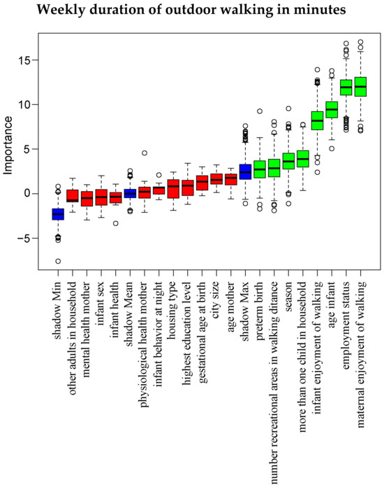 Figure 2 displays Boruta results for the weekly duration of walking. In descending importance, a longer duration was predicted by: greater maternal enjoyment of walking, employment status (most in mothers without a paid job), younger infants, greater infant enjoyment of being walked, only one child in the household, season (lowest in winter), more recreational areas in walking distance and preterm birth.