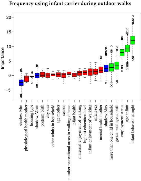 Boruta analysis predicting frequency of using infant carrier during outdoor walks. Wrapped around the random forest algorithm, Boruta tests the importance of each variable against that of shadow variables created through shuffling the original variables. Green variables are classified as important, whereas red variables are unimportant. Blue variables show minimal, medium and maximal importance of the shadow variables.