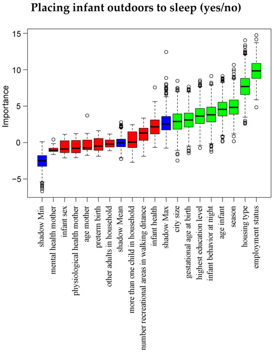 Figure 4 displays Boruta results for infant outdoor sleeping. Predictive of placing the infant outdoors to sleep were: employment status (highest in employed mothers), housing type (least in apartments), season (least in the winter), younger infants, higher scores on infant behavior at night, higher maternal education, lower gestational age at birth and smaller city size.