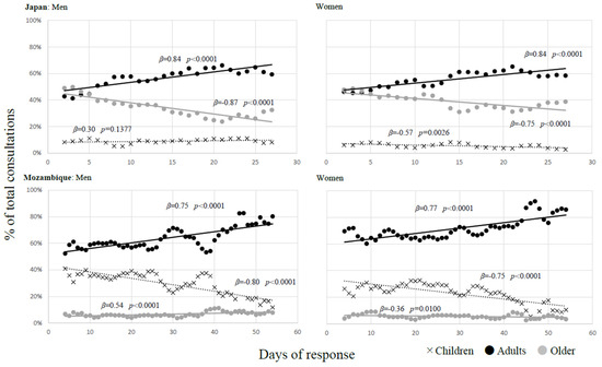 Figure 2 shows a comparative analysis of the observed trends regarding consultation percentages among men and women in Japan and Mozambique, with a focus on age comparison. In Japan, there was a significant increase in the number of adult consultations among men (β = 0.84, p < 0.0001) and women (β = 0.84, p < 0.0001). In contrast, a significant decrease was observed in the number of consultations for older men (β = −0.87, p < 0.0001) and women (β = −0.75, p < 0.001). Additionally, a decrease was noted in the number of consultations for girls (β = −0.57, p = 0.0026) in Japan.