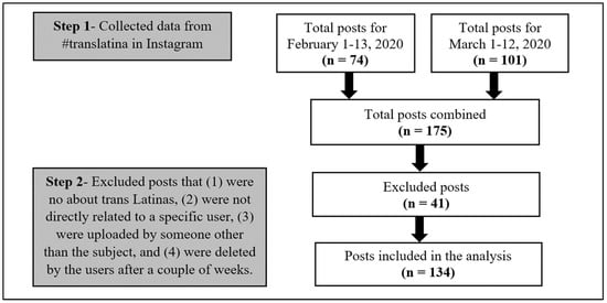 We selected Instagram posts under #translatina as the source of data. This hashtag was the most used related to trans Latinas, with over 7000 posts from various parts of the world linked to it at the time data were collected. We selected posts from the first two weeks of February 2020 and of March 2020 as our representational random sample “to represent a broad distribution of posting quantity” [23] (p. 117). A total of 74 posts were uploaded from 1 February 2020 to 13 February 2020, while 101 were uploaded from 1 March 2020 to 12 March 2020. Interestingly, while this timeline overlaps with the earliest months of the COVID-19 pandemic, the posts analyzed did not allude to the effects and dynamics that emerged during this time.
