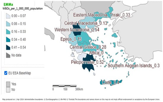 WGDOs were reported in 11 (84.6%) of the 13 regions of the country. In Attica and Ionian islands, no WBOs were reported. The highest mean annual notification rate for the period of 2004–2023 was recorded for the region of Western Macedonia (0.54 outbreaks/1,000,000 population). The mean annual notification rate of reported outbreaks by region for the period 2004–2023 is depicted in Figure 1.