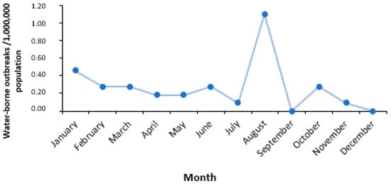 Twelve outbreaks (34.3%) occurred in August. The mean monthly notification rate of outbreaks per 1,000,000 people is depicted in Figure 2.