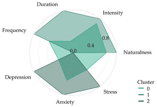Figure 2 illustrates variations in nature contact patterns and mental health indicators. A visual analysis of these variations suggests that Cluster 0 may represent individuals with a tendency towards greater access to and engagement with natural areas, possibly reflecting a more active lifestyle or a higher appreciation for time spent outdoors. This cluster, comprising 58.4% of the study population, includes individuals who have a higher frequency, duration, and intensity of contact with nature.