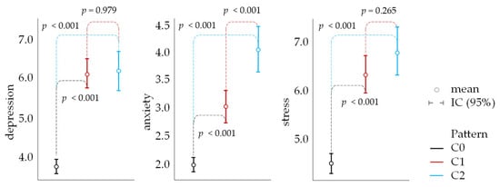 This profile reflects a notable commitment to outdoor time, whether for leisure or exercise, emphasizing the importance of green spaces to this group. In contrast, Cluster 1 presents a striking difference, with the majority of individuals spending 1 to 30 min (52.8%) and 31 to 60 min (31.0%) per week in nature, coupled with a high percentage (49.9%) that almost never engages with natural environments. This pattern suggests significant limitations in available time or accessibility to green spaces, indicating the need for public policies to encourage contact with natural environments and overcome barriers to access. For Cluster 2, the more evenly distributed time spent in nature, with an emphasis on the 31 to 60 min range (27.1%), and a diversity in contact frequency (29.1% “sometimes” and 17.8% “oftentimes”) reflects a balance in nature interactions. The lower proportion of “almost never” (15.3%) compared to Cluster 1 points to a more regular integration of nature into this group’s routines.