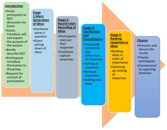 - Khurshid, F.; O’Connor, E.; Thompson, R.; Hegazi, I. Twelve tips for adopting the virtual Nominal Group Technique (vNGT) in medical education research. MedEdPublish 2023, 13, 18. [Google Scholar] [CrossRef] [PubMed]