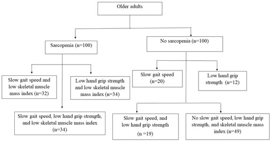 As mentioned previously, participants who met the criteria for slow gait speed and/or low grip strength and SMI were identified as having sarcopenia, whereas those who did not meet these criteria were classified as older adults without sarcopenia.