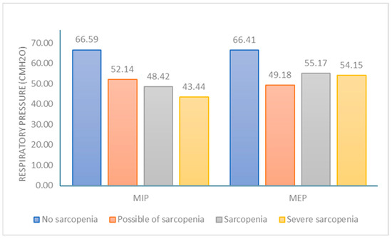 The MEP reflects the strength of the abdominal and other expiratory muscles, including those involved in coughing. Nevertheless, no statistically significant differences in MEP were detected in the sarcopenia and non-sarcopenia groups or in male and female participants, in contrast to the findings of Sawaya et al., where MEP was associated with sarcopenia but not MIP values [22]. The authors reported that the rectus abdominis, the expiratory muscle, comprises 46% of type IIB fibers, while the diaphragm muscle, which is the inspiratory muscle, comprises 80% of fatigue-resistant fibers (55% type I and 25% type IIA). In sarcopenia, muscle atrophy was detected in fast-twitch fibers; therefore, expiratory muscle strength was predisposed to reduce in the expiratory muscle, although not in the diaphragm, which showed a small change in muscle mass and muscle strength [22]. Hence, future studies need to explore changes in muscle fibers in the inspiratory and expiratory muscles of older adults with sarcopenia when compared with those in older adults without sarcopenia.