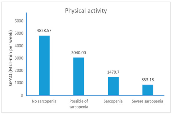 The proportion of participants according to sarcopenia assessed by the subgroup of sarcopenia and GPAQ (n = 200).