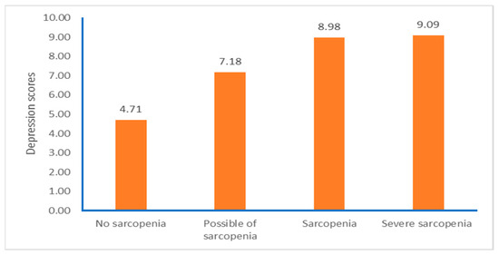 Regarding depressive symptoms, we found that older adults with sarcopenia had higher depression scores than those without sarcopenia. In two systematic reviews and meta-analysis studies, sarcopenia was associated with a high prevalence of depression. Additionally, sarcopenia was independently associated with depression (odds ratio, 1.57–1.82) [9,30]. In sarcopenia, depressive symptoms could be attributed to elevated levels of inflammatory mediators (i.e., tumor necrosis factor-alpha, C-reactive protein, and interleukin-6) [31,32,33], capable of increasing interstitial concentrations of norepinephrine, dopamine, serotonin, all neurotransmitters that function in the hypothalamus and hippocampus [30], or elevating inflammation and microglial activation in the hippocampus and frontal cortex, well known to be related to increased anhedonic and depressive-like behaviors [32]. Alternatively, sarcopenia may adversely affect depression through metabolism, endocrine systems, and chronic neuroendocrine immune inflammation [34].