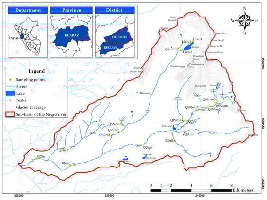 The Rio Negro sub-basin (9°38′40″ S; 77°23′12″ W) is located in the Olleros district, Ancash region, Peru. It covers an approximate area of 179.955 km2. The elevations range from 3300 to 5752 masl [29]. The district’s climate is characterized by two seasons: the flood season (from October to April) and the dry season (from May to September), with an average annual precipitation of 54.88 mm in 2022. The temperature ranges between 25 to −3.4 °C, with an average of 11.06 °C in 2022 [30,31]. The main river is the Olleros River, with a length of 6.319 km. This river flows into the Santa River, which is part of the Santa River basin, located on the Pacific watershed. The surface water in the area primarily originates from glacier melt (Cashán, Rurec, Uruashraju, Yanamarey, Pumahuacanca, Tuctu, and Pucaraju) and rainfall, which accumulates in lagoons (Tarahua, Huansan, and Collotacocha) and flows through gullies and rivers (Olleros and Negro) [23,24,25,26,32].