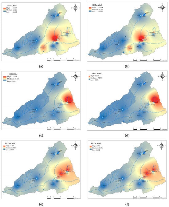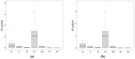 The results of the Hazard Index (HI) values for the metals (Fe, Li, Al, Co, Mn, Ni, and Zn) are displayed in Figure 3. The HI for the studied metals ranged between 4.673 × 10−5 and 8.049 in children, and between 2.155 × 10−5 and 3.714 in adults. Moreover, the HI values in children and adults were in the following decreasing order: Co > Fe > Li > Mn > Al > Ni > Zn. On the other hand, the values of HQin were higher than HQd, indicating that the main route of non-carcinogenic risk was direct ingestion. It was also observed that the HI for children was higher than the HI for adults, indicating that children are more susceptible.