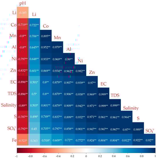 Pearson correlation coefficients for the parameters pH, EC, TDS, salinity, Li, Co, Mn, Al, Ni, Zn, Fe, S, and SO42− from surface water samples of the Río Negro sub-basin; (*) indicates significant correlation at p < 0.05 (two-tailed) and (**) indicates significant correlation at p < 0.01 (two-tailed).