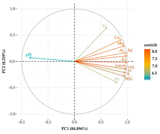 The feasibility results of the data, such as the Kaiser–Meyer–Olkin value (0.813) and Bartlett’s test of sphericity (p < 0.05), indicated that it was appropriate to perform a PCA. Two components with eigenvalues > 1 (PC1 with an eigenvalue of 11.036 and PC2 with 1.074) were extracted, explaining 93.155% of the total variance. The loading plot (Figure 6) showed that PC1 explained 84.896% of the total variance, with loadings for the pH (−0.854), EC (0.980), TDS (0.979), salinity (0.981), SO42− (0.949), Fe (0.808), S (0.966), Li (0.614), Al (0.967), Co (0.882), Mn (0.942), Ni (0.985), and Zn (0.994) being higher, and PC2 explained 8.259%, with the loading for Li (0.795) being higher.