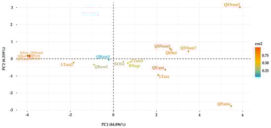 The score plot (Figure 7) showed that QSNom3 had high scores on PC1 and PC2, indicating significant contamination with Li, Co, and Mn, and moderate contamination with Al and Ni; QPuma had a high score on PC1 and a low score on PC2, indicating considerable contamination with Fe, SO42−, and S. On the other hand, sampling points QRure1, QQuil, QArar, QSNom2, QPuyh, QSNom4 had low scores on PC1, indicating a high pH and low contamination with Li, Co, Mn, Al, Ni, Zn, S, SO42−, and Fe.