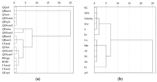 The CA dendrogram for sampling points is shown in Figure 8. Cluster 1 contained QQuil, QRure1, QArar, QSNom4, QPuyh, and QSNom2, representing water from lateral streams, which have a pH close to 7 and low metal concentration. Cluster 2 contained QPuma, QSNom3, QRure2, QRure3, LTara2, QOtut, QSNom5, QSNom7, RNegr, ROlle, LTara3, LTara1, and QUqui, representing surface water from the main channel, which has a pH less than 4 and high metal concentration. The CA dendrogram for parameters is shown in Figure 8. Cluster 1 contained EC, TDS, salinity, SO42−, S, Fe, Co, Mn, Al, Ni, Zn, and Li, and cluster 2 contained the pH.
