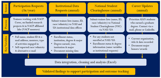 Implementation of a longitudinal trainee tracking and outcome system: Once the team constructed a list of trainees engaged through partnership activities, the evaluation team developed a system to implement longitudinal participation and long-term tracking to inform program evaluation. The data management structure was driven by NACP’s output and reporting needs, which were also informed by CPACHE goals. Figure 1 outlines the data sources (participation requests, institutional data requests, National Student Clearinghouse (NSC), and career updates), describes the processes for obtaining records for each data source, and identifies key evaluation variables for each source. All data flows into an integrated Excel database for tracking validated findings to support participation and outcome tracking.
