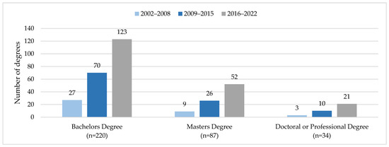 NACP impact on Native American and Alaska Native students: Of the 367 AIAN trainees affiliated with the program, 237 students earned 341 degrees (some students earned more than one degree), 196 of which were earned in the past 7 years (Figure 3). The findings are organized over a 7-year period to evenly distribute units of measurement through time (Figure 3). Only degrees obtained after students became affiliated with NACP were included in tracking. Comparing two evaluation periods 2002–2008 and 2016–2022, the number of bachelor’s degrees attained by AIAN participants increased nearly 5-fold (27 to 123), master’s degrees nearly 6-fold (9 to 52), and doctoral degrees 7-fold (3 to 21). The most common bachelor’s degrees were in public health, biology, and biomedical science; the most common master’s degrees were in public health, biology, and chemistry. At a professional level, 10 AIAN trainees earned an MD, and 3 trainees earned a DPT, while the 21 individuals who earned a doctoral degree were from public health, American Indian studies, higher education, biochemistry, biology, biophysics, cancer biology, chemistry, clinical translational science, microbiology/immunology, and pharmacology/toxicology.