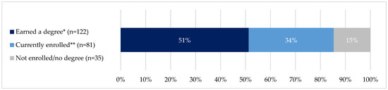 Outcomes for Native Americans and Alaska Natives who participated in mentored research: Notably, 426 trainees were engaged in mentored research experiences 56% (n = 238) were AIAN. Moreover, 85% of AIAN trainees who participated in mentored research demonstrate strong outcomes with 51% having earned at least one degree and 34% were enrolled at the last checkpoint in 2022 (Figure 4).