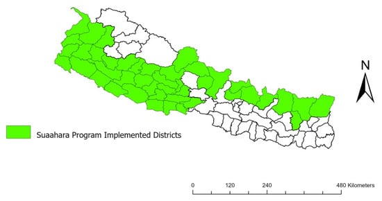 Figure 1. “Suaahara” program implemented districts (source: Survey Department, Ministry of Land Management, Cooperatives and Poverty Alleviation, Nepal).