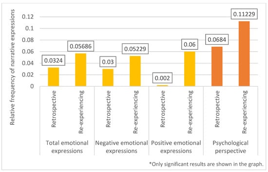After transcribing the interviews into verbatim text, each high- and low-point episode underwent quantitative analysis using the Narrative Categorical Content Analysis algorithm (NarrCat). NarrCat is a toolkit using six Psycho-Thematic Modules that quantifies psychological processes in narratives, identifying verbs, phrases or idioms assumed to be the textual markers of emotional expressions, and temporal perspectives [,]. The Spatio-Temporal Perspective Module encompasses the forms of Retrospective and Re-experiencing perspectives [], which we used in this study to group participants. Subsequently, we examined the differences between the Retrospective and Re-experiencing groups’ narratives in terms of the use of words and expressions identified by the Psychological Perspective module (as presented in Figure 1). NarrCat defines Psychological Perspective as the range of mental states attributed to individuals and groups in texts, aiding in the exploration of mental processes, thoughts, and beliefs. It consists of the Emotion, Cognition, and Intentionality-Agency submodules. The Emotional submodule categorizes emotions into Positive (e.g., “joy”, “contentedness”, “hope”) and Negative (e.g., “suffering”, “disappointment”, “uneasiness”) groups, while the Cognition submodule includes mental verbs (“generalize”, “ponder”), nouns (“thought”, “decision”, “idea”), and mental idioms denoting cognitive processes (Laszlo et al., 2013 []). Intentionality can be expressed by intentional auxiliary verbs (such as “want”, “will”, and “wish”) and by intentional nouns (“goal”, “plan”), adverbs (“goal-mindedly”), adjectives (“intentional”), and postpositions. The more intentional words and expressions are used by the narrator, the more goal-oriented and efficient the agent appears to be [,].
