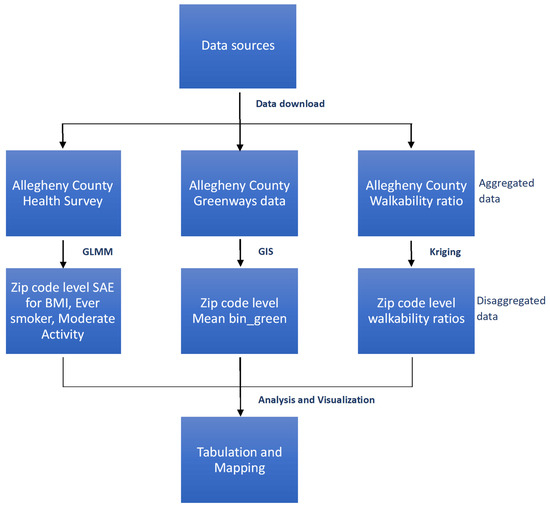 In recent years, research has focused on combining health and behavioral risk data with built environment data. Aggregated health data are often provided at different spatial levels—from county and metropolitan areas to zip codes, census tracts, or nearest intersections [25]. Similarly, built environment data contains several variables of interest, again at different geospatial levels, thus making it necessary to develop new methods of spatial analysis to disaggregate the different types of data at different scales. Let us, for instance, take the well-known Behavioral Risk Factor Surveillance System (BRFSS) surveys [26] of the U.S. Centers for Disease Control and Prevention (CDC). Disaggregation of such population behavioral risk data to finer geographical scales can provide key insights into certain public health challenges that are uniquely present at spatially local levels, such as municipalities or zip codes, where the effects of a given SEDH of interest may be most precisely understood, and thus, effectively actionable.
