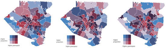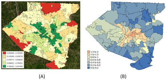 GIS data from the Allegheny County–Greenways dataset was used not only to locate the green spaces all across the county but also to select the types that are most likely to allow public access, e.g., different types of parks in different areas (see Supplementary Table S1). Two types of statistics were computed—percent green space within 500 m and a binary value that indicates whether there is any green space within 500 m of a random individual’s location in a zip code. We used the latter Mean bin_green (defined by the proportion of the population residing in Z that has access to any green space within 500 m) as it better represents access to green spaces owing to the weighted selection of point locations by the underlying block populations The map of MBG (Figure 2A) highlights the overall spatial distribution along with the local disparities in green space access in the county.