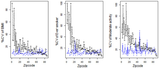 Finally, we compared the percent coefficient of variation of the small area estimates with direct estimates, since SAE with low CVs are considered precise and reliable. Distribution of %CVs of direct and small area estimates are reported in Table 1. Zip code-specific %CVs of direct, and small area estimates are given in Figure 5. Table 1 and Figure 5 show the unstable direct estimates of BMI, Ever-smoker, and Moderate activity; CV of BMI ranges from minimum of 4.93 to maximum of 90.20% (mean = 18.64%) while CV of Ever-smoker ranges from minimum of 5.99% to maximum of 100.01% (mean = 24.89%) and CV of Moderate activity ranges from minimum of 8.98% to maximum of 102.61% (mean = 32.22%). On the other hand, small area estimates seem to be reasonably stable as the CV of BMI ranges from minimum of 5.33% to maximum of 18.31% (mean = 9.63%), while CV of Ever smoker ranges from minimum of 6.63% to maximum of 32.82% (mean = 11.84%) and CV of Moderate activity ranges from minimum of 9.68% to maximum of 53.99% (mean = 18.18%). The model based small area estimates appear to be more precise and reliable than the direct estimates.