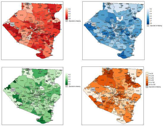 Green spaces data: The Allegheny County Greenways data for 2021 [31] were obtained from Pennsylvania Spatial Data Access (PASDA, which is PA’s official public access open geospatial data portal). The Greenways feature class consists of a compilation of GIS data (with lat–long coordinates) on various categories of parks, trails, land green properties, park nodes, and City of Pittsburgh Greenways, which we included among accessible green spaces. Other categories, such as agricultural easements, sensitive slopes, etc., were excluded from our analysis. (A summary is available in Supplementary Table S1.)
