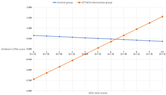 Consistent with the hypotheses, the ATTACH™ parenting intervention moderated associations between maternal ACEs and CTRA scores, specifically for children, but not as hypothesized. Based on the literature review, it was hypothesized that the ATTACH™ intervention would buffer, flatten, or reduce the association between higher maternal ACEs and higher child CTRA scores. Instead, the interaction was such that an association between maternal ACEs and CTRA scores was only evident in the intervention group, such that low maternal ACEs were associated with lower child CTRA scores. In other words, in contrast with other literature demonstrating the parenting programs that may be most beneficial for those at higher risk [34,35], the ATTACH™ intervention had the most benefit for or impact on child CTRA in children of mothers with low ACEs. Specifically, above maternal ACEs scores of seven, the CTRA scores of children in the intervention group were effectively the same as those of children in the control group.
